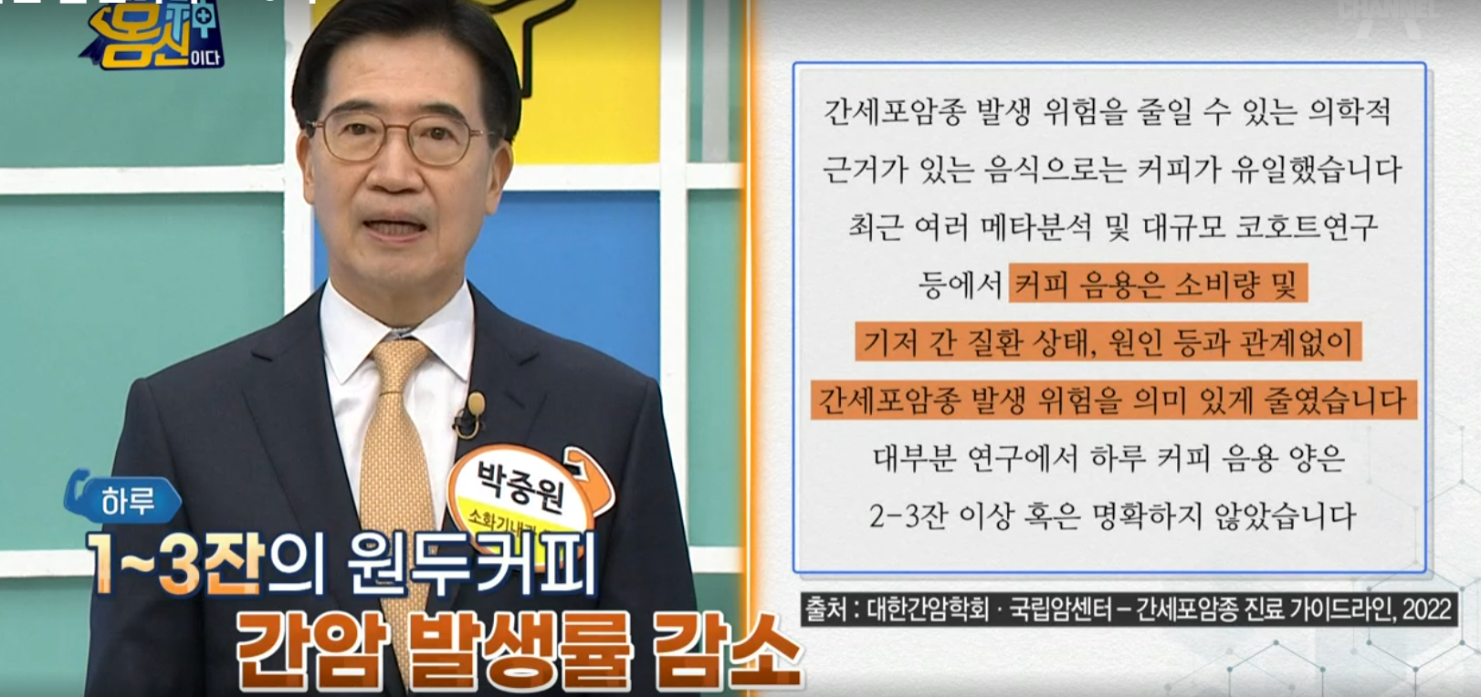 의학적, 과학적으로 입증관 간에 좋고 간암 예방에 도움이 되는 음식은 1개뿐인데, 바로 원두커피입니다.