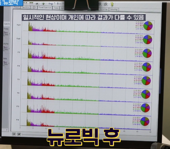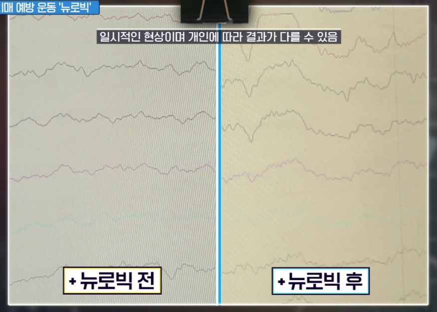 실제로 엄지의 제왕에서 참가자를 통해 뉴로빅 전후의 뇌파를 검사를 했는데, 확실히 뉴로빅 이후 뇌파 활동이 활발해진 것을 확인할 수 있었습니다.