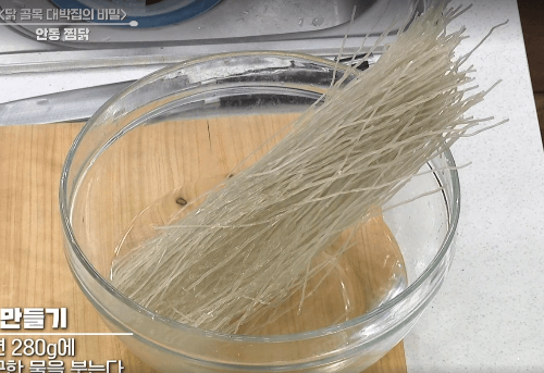 3. 마른 찰당면 280g을 미지근한 물에 20~30분 정도 불려서 준비한다.