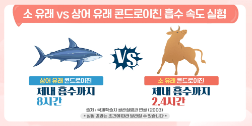 실제로 소 유래 콘드로이친과 상어 유래 콘드로이친의 체내 흡수 속도를 실험한 결과에서는 상어 유래 콘드로이친이 8시간, 소 유래 콘드로이친은 2.4시간으로 나타나 인체 연골과 흡사한 구조를 가진 소 유래 콘드로이친이 4배나 빠르게 체내로 흡수된다는 것을 알 수 있었습니다.