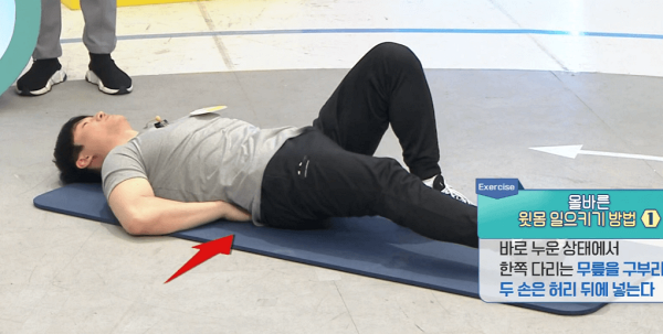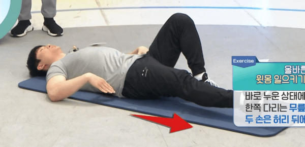 1. 바로 누운 상태에서 한쪽 다리는 무릎을 구부리고 두손은 허리 뒤에 넣는다.