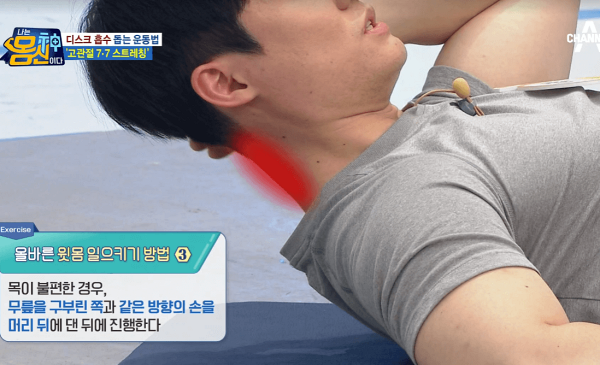 3. 목이 불편한 경우, 무릎을 구부린 쪽과 같은 방향의 손을 머리 뒤에 댄 뒤에 진행한다.