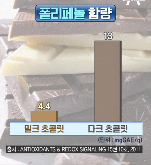 다크 초콜릿과 밀크 초콜릿의 총 폴리페놀 함량을 비교해보니 다크 초콜릿이 밀크 초콜릿보다 약 3배 정도가 많이 함유되어 있었다는 것을 확인했습니다.