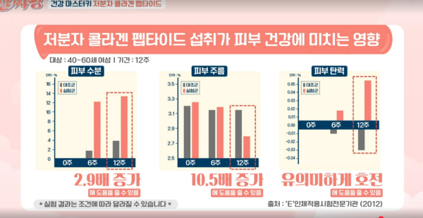 41세~58세 여성을 대상으로 8주간 저분자 콜라겐 펩타이드를 섭취한 결과 진피 치밀도는 10.3배 증가, 표피층 수분량은 14.6배 증가했고, 피부 주름은 11.2배 감소했다는 것을 확인했고, 섭취를 중단했음에도 2주동안 피부 탄력이 지속되었다고 합니다.