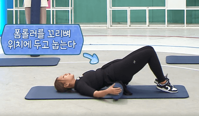 1. 폼롤러를 꼬리뼈 위치에 두고 눕는다.